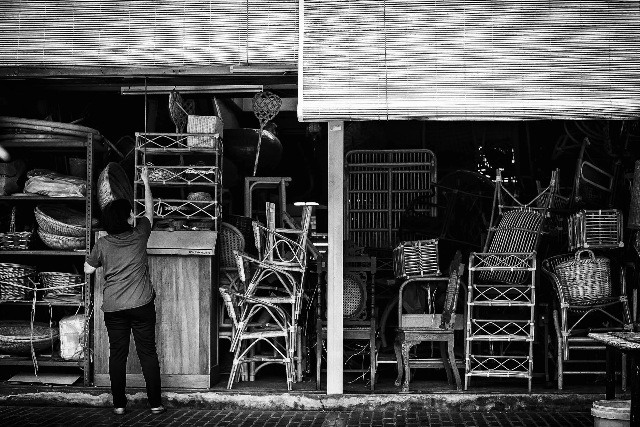 Mr and Mrs Chen go through a daily ritual of unpacking the rattan furniture from their stacks, so they can be displayed for sale.